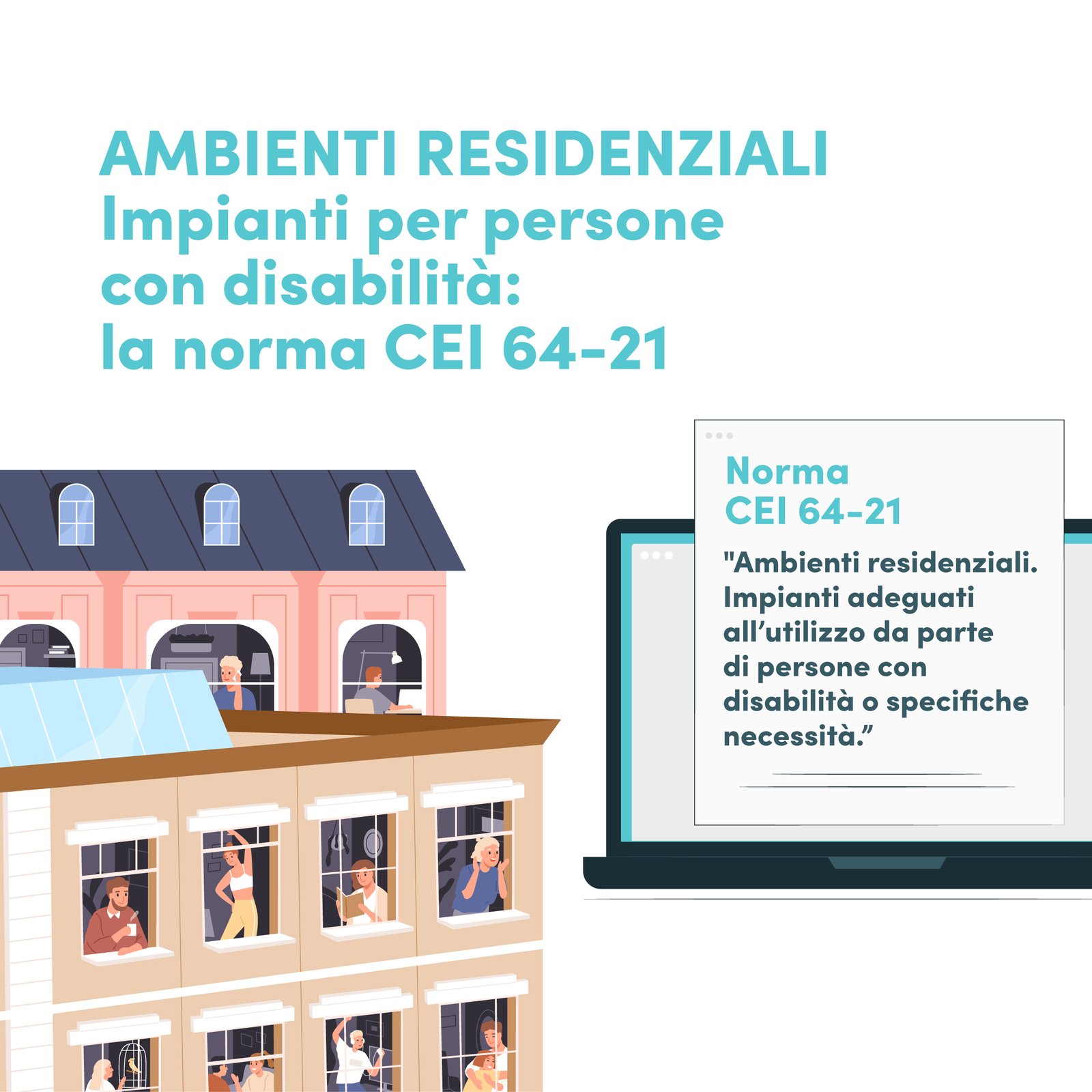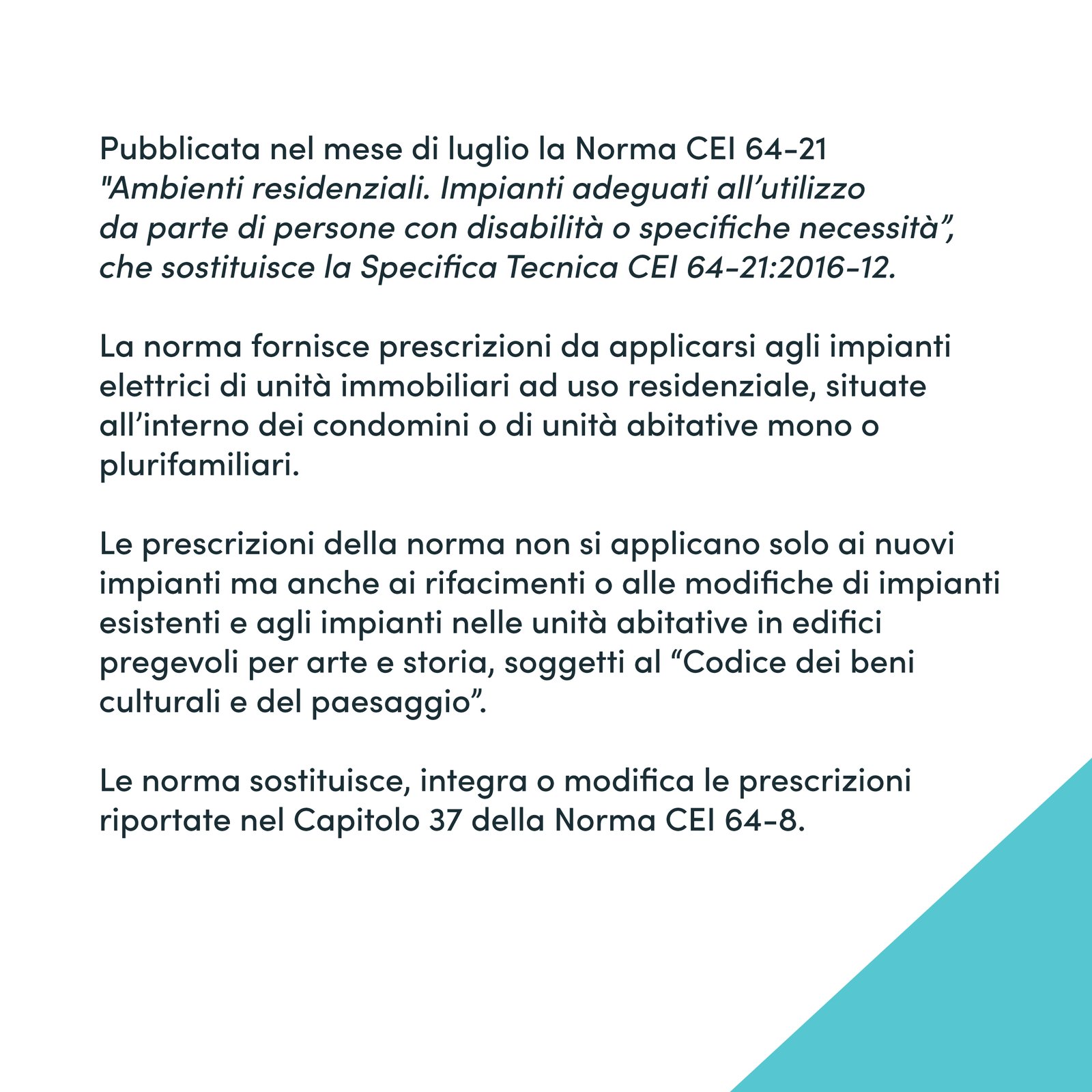 Pubblicata nel mese di luglio la Norma CEI 64-21 “Ambienti residenziali. Impianti adeguati all’utilizzo da parte di persone con disabilità o specifiche necessità”, che sostituisce la Specifica Tecnica CEI 64-21:2016-12. La norma fornisce prescrizioni da applicarsi agli impianti elettrici di unità immobiliari ad uso residenziale, situate all’interno dei condomini o di unità abitative mono o plurifamiliari.