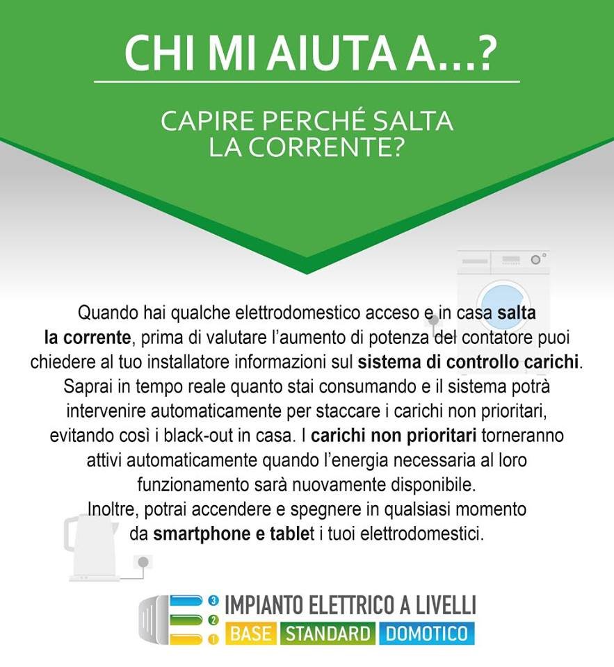 Quando hai qualche elettrodomestico acceso e in casa salta la corrente, prima di valutare l’aumento di potenza del contatore puoi chiedere al tuo installatore informazioni sul sistema di controllo carichi.