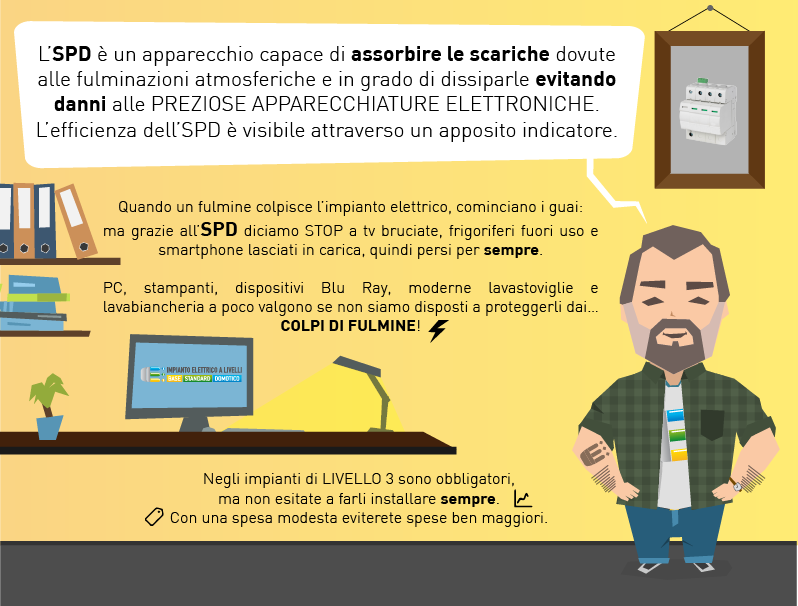 L’SPD è un apparecchio capace di assorbire le scariche dovute alle fulminazioni atmosferiche e in grado di dissiparle evitando danni alle PREZIOSE APPARECCHIATURE ELETTRONICHE.