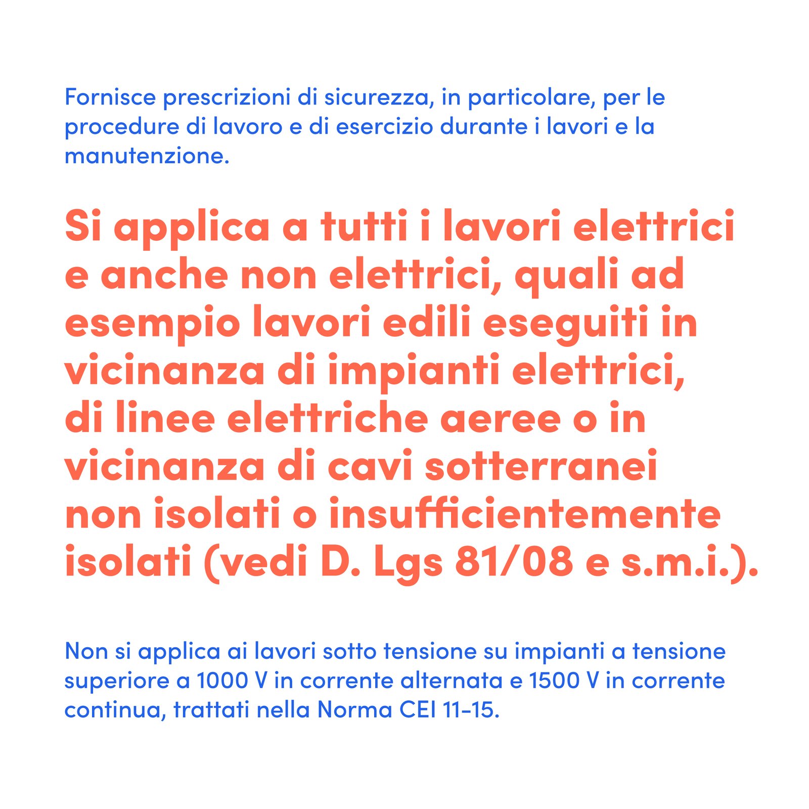 Si applica a tutti i lavori elettrici e anche non elettrici, quali ad esempio lavori edili eseguiti in vicinanza di impianti elettrici, di linee elettriche aeree o in vicinanza di cavi sotterranei non isolati o insufficientemente isolati (vedi D. Lgs 81/08 e s.m.i.). Non si applica ai lavori sotto tensione su impianti a tensione superiore a 1000 V in corrente alternata e 1500 V in corrente continua, trattati nella Norma CEI 11-15.