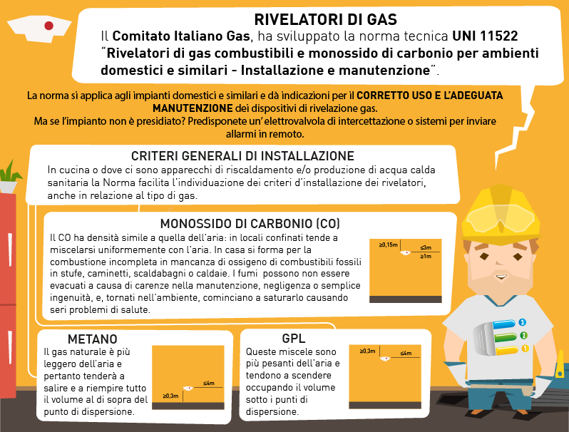 La Norma consente un’agevole individuazione dei criteri di installazione dei rivelatori di gas, individuando gli specifici criteri di installazione in relazione alla tipologia di gas.
